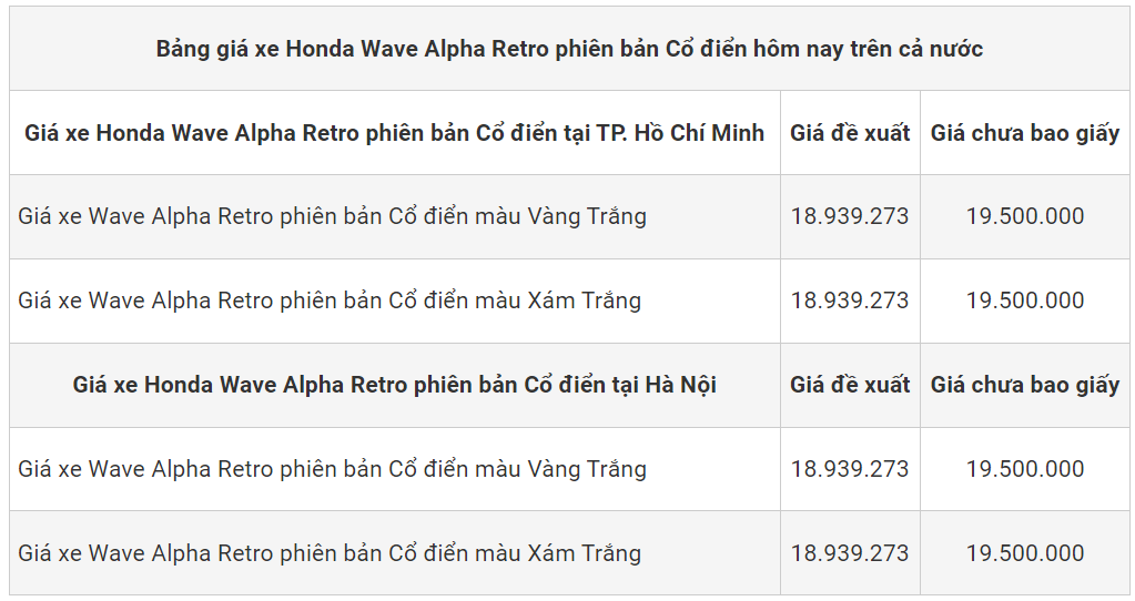 Lưu ý: Giá xe Wave Alpha Retro phiên bản Cổ điển mới trên đã gồm thuế VAT, chưa bao gồm lệ phí trước bạ và phí cấp biển số, bảo hiểm xe máy.