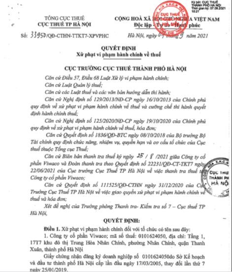 Cục Thuế TP. Hà Nội đã ban hành Quyết định 33950/QĐ-CTHN-TTKT7-XPVPHC về việc xử phạt vi phạm hành chính về thuế đối với Công ty Cổ phần Viwaco (Viwaco, UPCoM: VAV) qua kỳ thanh tra thuế các năm 2019 và 2020 tại công ty.