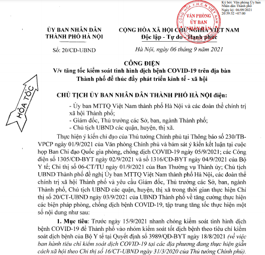 | Công điện số 20/CĐ-UBND của UBND TP Hà Nội về việc tăng tốc kiểm soát tình hình dịch bệnh Covid-19 trên địa bàn Thành phố |