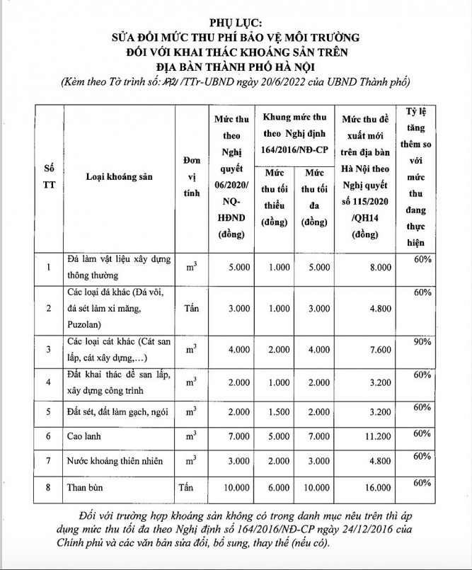 Theo tờ trình của UBND Thành phố, hiện nay, thực trạng nguồn tài nguyên khoáng sản trên địa bàn thành phố Hà Nội dần cạn kiệt, việc khai thác khoáng sản trên địa bàn có khả năng gây tác động tiêu cực đến môi trường, nhất là các hoạt động về khai thác cát, đất đá. Trong khi đó, quy định về mức thu phí bảo vệ môi trường đối với khai thác khoảng sản trên địa bàn thành phố Hà Nội không thay đổi trong thời gian dài.