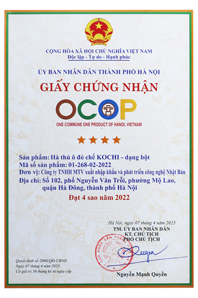 Hà thủ ô đỏ chế Kochi đã đạt được nhiều chứng nhận uy tín như: Top Hàng Việt Nam được người tiêu dùng yêu thích bình chọn; Hàng Việt Nam chất lượng cao; OCOP 4 sao. Rất hiếm có sản phẩm hà thủ ô nào ở Việt Nam đạt được đồng thời những danh hiệu này như của Hà thủ ô đỏ chế Kochi. Những chứng nhận, danh hiệu này thể hiện uy tín, chất lượng của Hà thủ ô đỏ chế Kochi, cũng như sự tin yêu của Quý khách hàng.