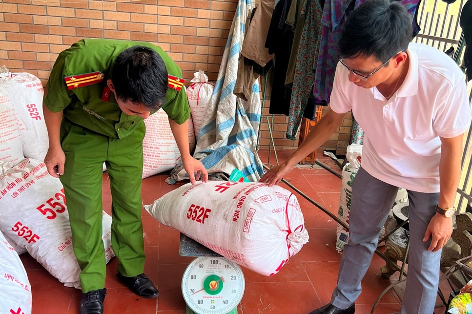 Quá trình kiểm tra, lực lượng chức năng phát hiện tại khu vực chăn nuôi của gia đình bà Nguyễn Thị Lương có 9 bao tải màu đỏ và 24 bao tải màu xanh đựng mỡ bò (khoảng hơn 1 tấn) đã được chế biến.