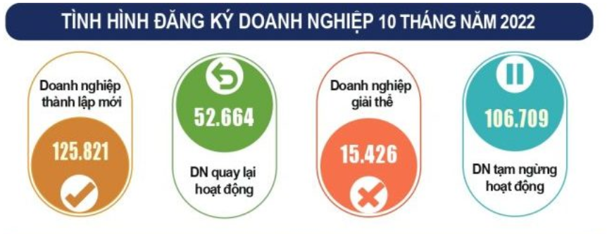 Ngoài ra, trong tháng 10 còn có 3,9 nghìn doanh nghiệp quay trở lại hoạt động, giảm 23,7% so với tháng trước và giảm 9,3% so với cùng kỳ năm 2021; có 4.058 doanh nghiệp đăng ký tạm ngừng kinh doanh có thời hạn, tăng 38,3% và tăng 16,2%; có 4.200 doanh nghiệp ngừng hoạt động chờ làm thủ tục giải thể, tăng 0,3% và tăng 37,8%; có 1.602 doanh nghiệp hoàn tất thủ tục giải thể, tăng 5,7% và tăng 98,8%.