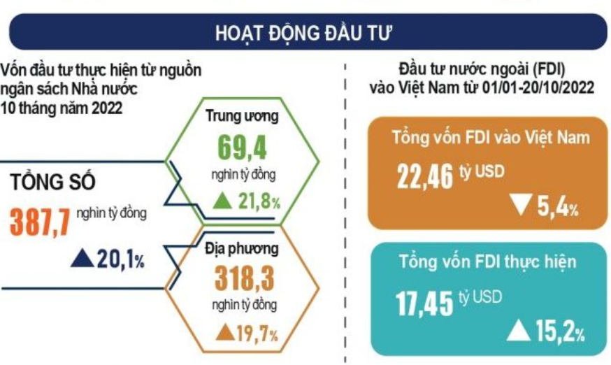 Cũng theo Tổng cục Thống kê, về đầu tư, vốn đầu tư thực hiện từ nguồn NSNN riêng trong tháng 10 ước đạt 53,6 nghìn tỷ đồng, tăng 24,2% so với cùng kỳ năm trước. Tính chung 10 tháng năm 2022, vốn đầu tư thực hiện từ nguồn NSNN ước đạt 387,7 nghìn tỷ đồng, bằng 67,1% kế hoạch năm và tăng 20,1% so với cùng kỳ năm trước (cùng kỳ năm 2021 bằng 64,7% và giảm 8,3%).