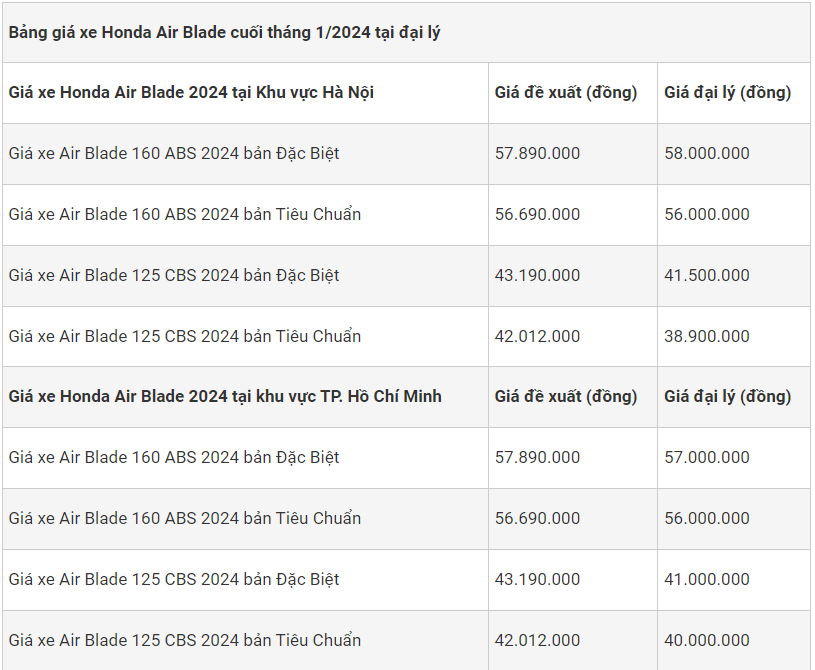 Về giá bán, Honda Air Blade 2024 đang được phân phối tại Việt Nam với 2 phiên bản động cơ 125cc và 160cc. Khảo sát tại nhiều đại lý cho thấy dòng xe này đang có dấu hiệu giảm mạnh, nhiều đại lý bán dưới giá đề xuất của hãng. Cụ thể như sau: