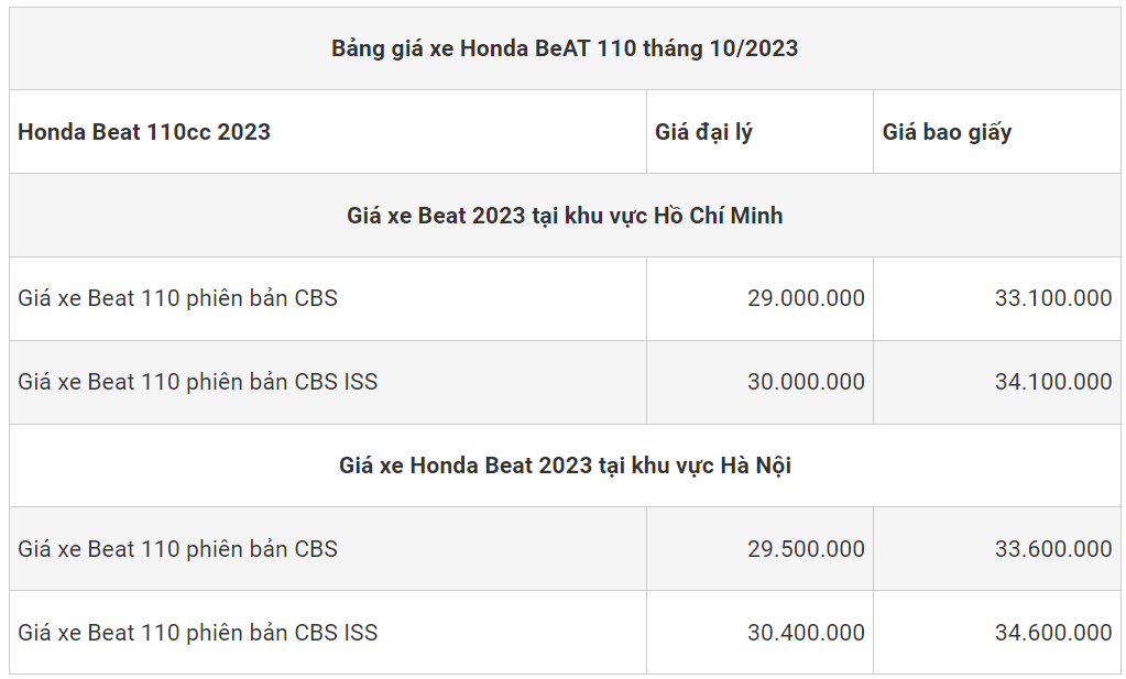 * Bảng giá xe tay ga Beat 2023 trên là giá trung bình trên thị trường xe máy tại Việt Nam, giá bán lẻ tại các đại lý Honda khác nhau có thể khác nhau và bạn nên tham khảo giá xe Beat 110 2023 ở một vài cửa hàng để tìm được mức giá tốt nhất!