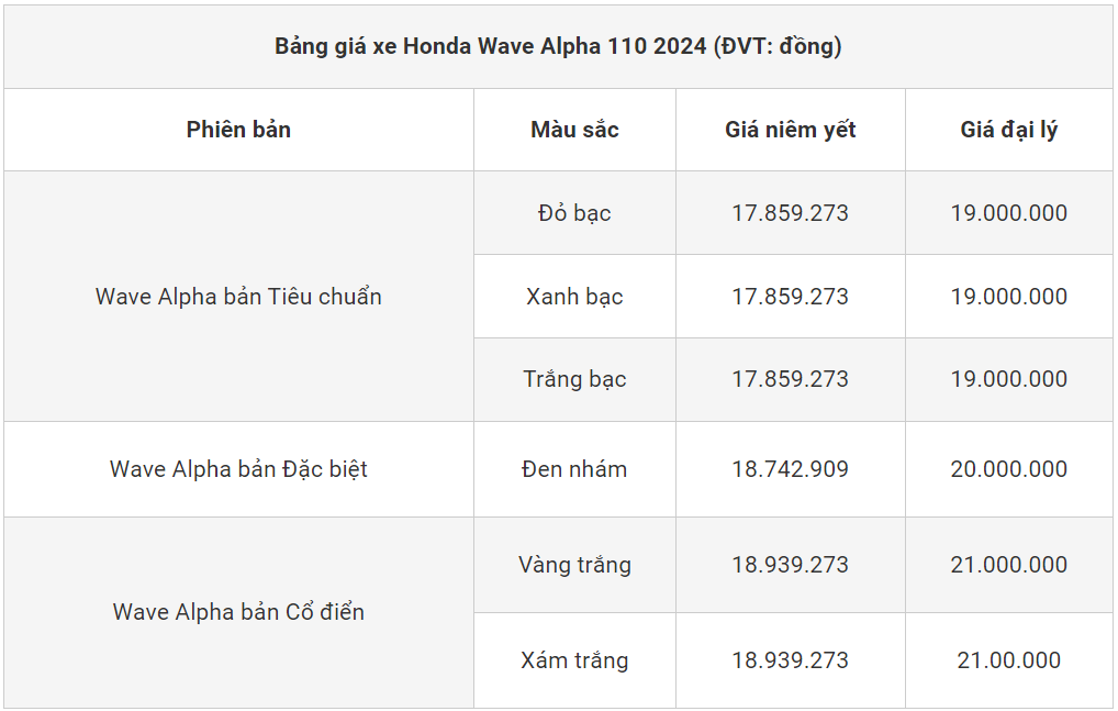 Lưu ý: Bảng giá xe Honda Wave Alpha 110 2024 ở trên chỉ mang tính chất tham khảo. Giá xe có thể thay đổi tùy theo thời điểm của mỗi đại lý Honda và khu vực bán xe.