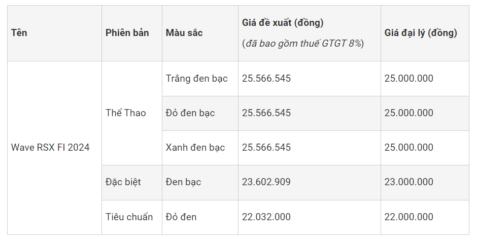 Được biết, mẫu xe Honda Wave RSX FI 2024 mở bán tại Việt Nam từ ngày 6/12/2023 với 3 phiên bản cùng mức giá đề xuất dao động từ 22 – 24,5 triệu đồng (đã bao gồm VAT 8%). Tuy nhiên, chỉ trong ít ngày bán chính thức, mẫu xe số này đã được các đại lý ưu đãi hàng triệu đồng. Cụ thể: