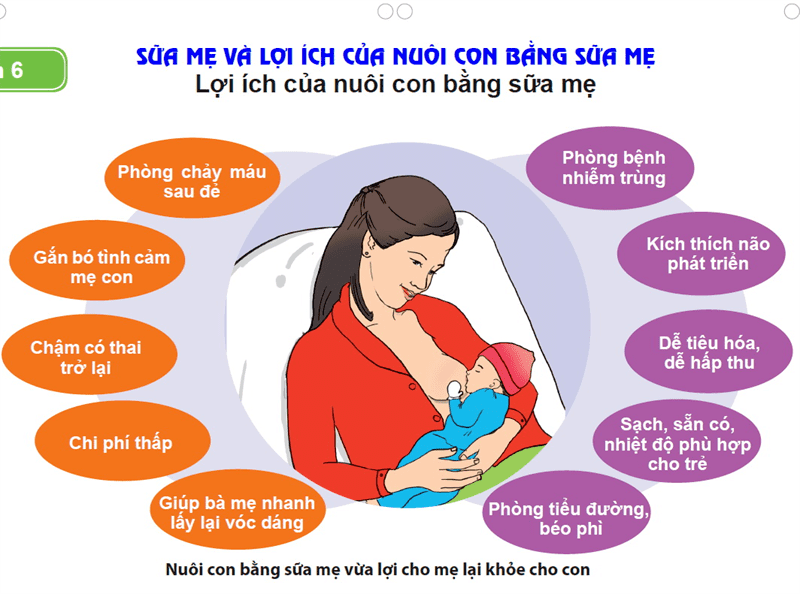 Sữa mẹ cung cấp tất cả các chất dinh dưỡng cần thiết và dễ tiêu hoá cho sự phát triển của trẻ như: chất đạm, chất béo, đường, các vitamin và khoáng chất. Sữa mẹ chứa nhiều kháng thể giúp phòng ngừa các nhiễm khuẩn hô hấp, tiêu hoá và các nhiễm khuẩn khác ở trẻ nhỏ. Trẻ được bú mẹ thường phát triển trí não tốt hơn, giảm nguy cơ thừa cân béo phì và mắc đái tháo đường khi trưởng thành.