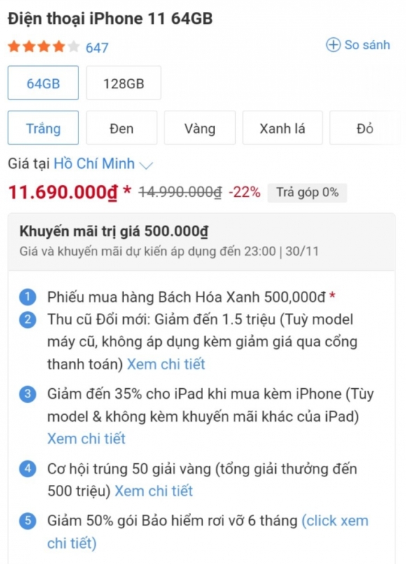 Điện thoại iPhone 11 64GB đang được bán tại hệ thống Thegioididong.com với giá 11.190.000 đồng tại Hà Nội, tại Thành phố Hồ Chí Minh, phiên bản này có giá 11.690.000 đồng. Như vậy, giá của iPhone 11 giữa 2 miền Nam, Bắc có sự chênh lệch 500.000 đồng.