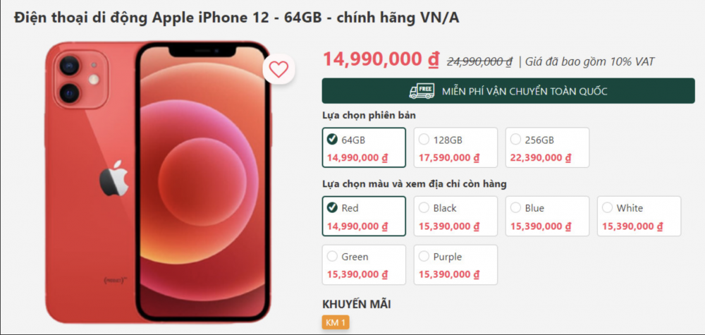 iPhone 12 64GB đang được các đại lý niêm yết giá bán từ 14.990.000 triệu đồng. Giữa các đại lý và các hãng sẽ có sự chênh lệch về giá nhưng nói chung không đáng kể.