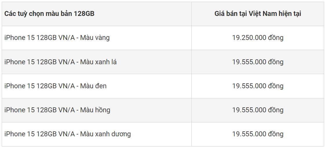 Giá bán iPhone 15 phiên bản tiêu chuẩn