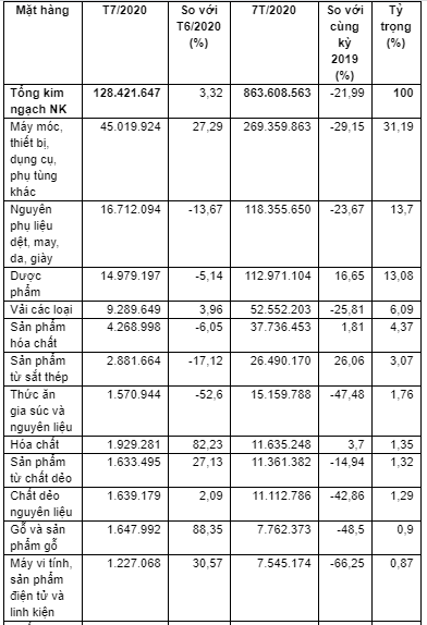 Theo số liệu thống kê sơ bộ của Tổng cục Hải quan, tổng kim ngạch nhập khẩu hàng hóa của Việt Nam từ thị trường này trong 7 tháng đầu năm đạt 863,61 triệu USD, giảm 22% so với cùng kỳ.