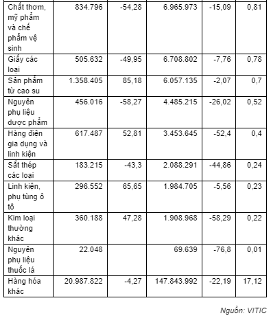 Cụ thể: Máy móc, thiết bị, dụng cụ, phụ tùng khác đạt 269,36 triệu USD (chiếm 31,19%); Nguyên phụ liệu dệt, may, da, giày đạt 118,35 triệu USD (chiếm 13,7%); Dược phẩm đạt 112,97% (chiếm 13,08%). Trong đó hai mặt hàng đầu có kim ngạch sụt giảm và mặt hàng cuối có kim ngạch tăng trưởng so với cùng kỳ.