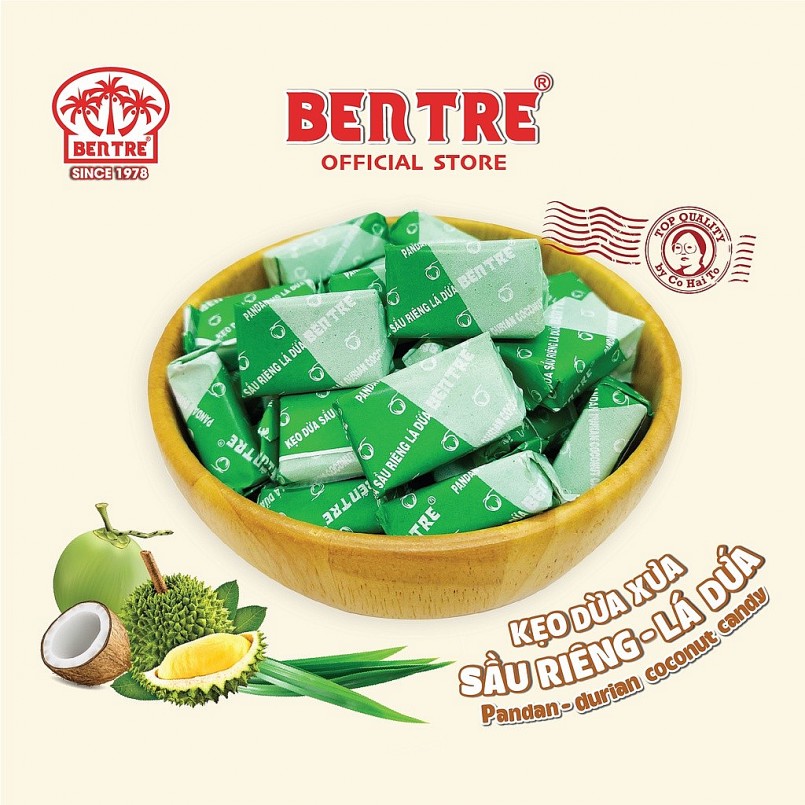 “Kẹo dừa sầu riêng lá dứa” với nhãn hiệu Bến Tre sử dụng nguyên liệu thiên nhiên. Từ nước cốt dừa nguyên chất là thứ đặc sản đặc biệt chỉ có ở quê hương “Xứ Dừa”, kết hợp với đường cát trắng và mạch nha chiết xuất từ gạo nếp cùng sầu riêng và lá dứa tươi. Nét độc đáo riêng của sản phẩm là sự hội tụ tinh túy của hương vị, màu sắc của cơm sầu riêng có nguồn gốc Cái Mơn, Chợ Lách và nước cốt lá dứa tươi. Sự hòa quyện đó mang đến hồn cốt riêng, gói trong mỗi viên kẹo là màu xanh của bầu trời và màu vàng của đất mẹ Bến Tre.