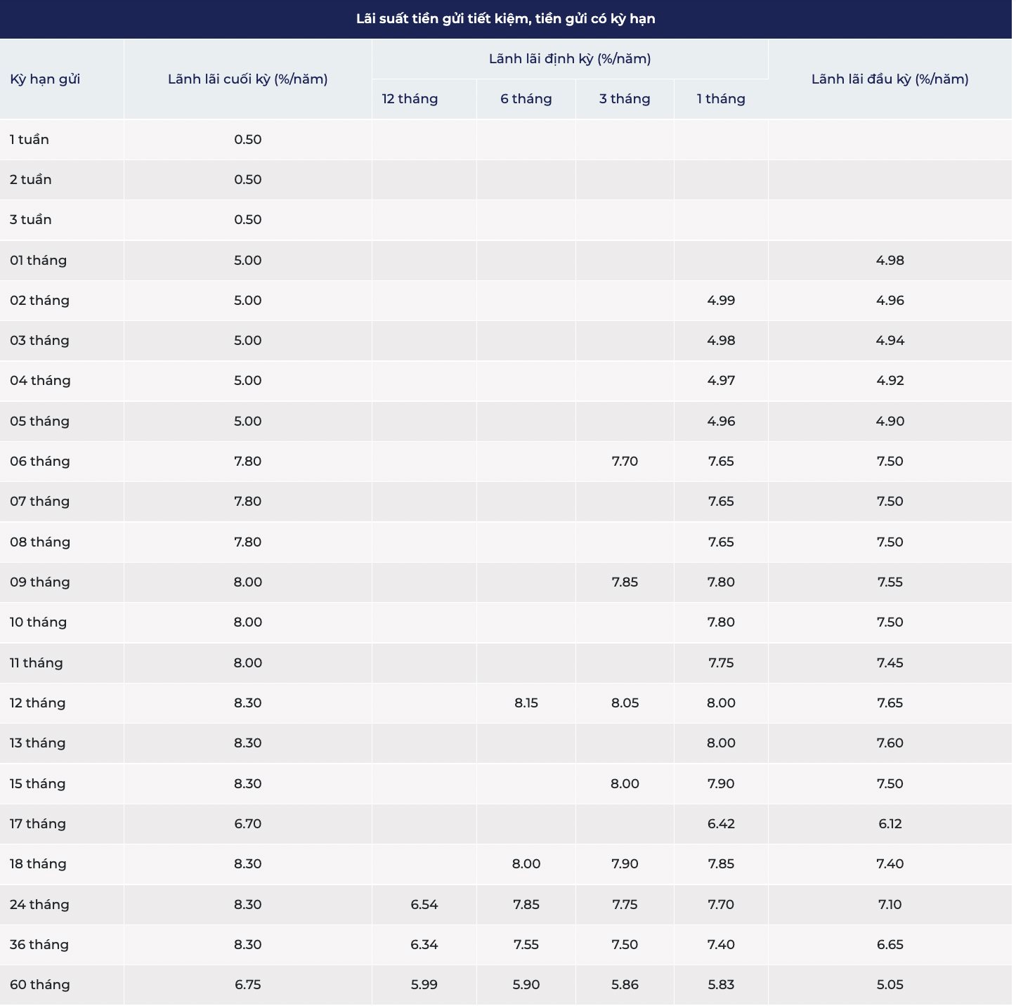 Cụ thể, lãi suất tiết kiệm dành cho tiền gửi có kỳ hạn từ 1 tháng đến 5 tháng đồng loạt tăng 1 điểm %. Trong đó, các kỳ hạn 1 - 5 tháng đang có chung mức lãi suất là 5%/năm và các kỳ hạn 6 - 8 tháng có cùng mức 7,8%/năm.