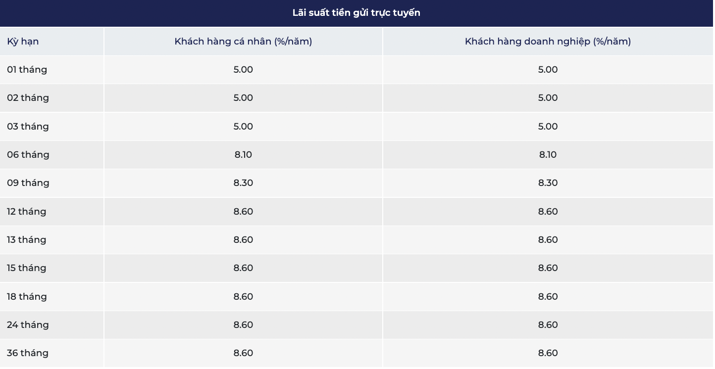 Khung lãi suất ngân hàng này được áp dụng cho các khoản tiết kiệm có kỳ hạn 1 - 36 tháng. Trong đó, mức cao nhất là 8,6%/năm được triển khai cho hai kỳ hạn 13 tháng đến 36 tháng.