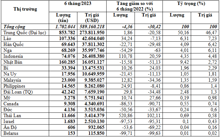Nhìn chung, trong 6 tháng năm 2023 nhập khẩu phân bón từ đa số các thị trường giảm cả về khối lượng và kim ngạch so với cùng kỳ năm 2022.