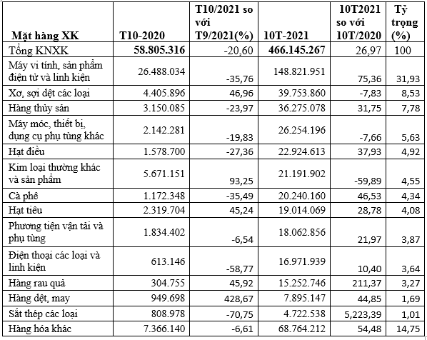 Những mặt hàng xuất khẩu có kim ngạch xuất khẩu giảm trong 10 tháng/2021: xơ, sợi dệt các loại giảm 7,8%; máy móc thiết bị, dụng cụ và phụ tùng giảm 7,6%; kim loại thường khác và sản phẩm giảm 59,8% so với 10 tháng/2021.