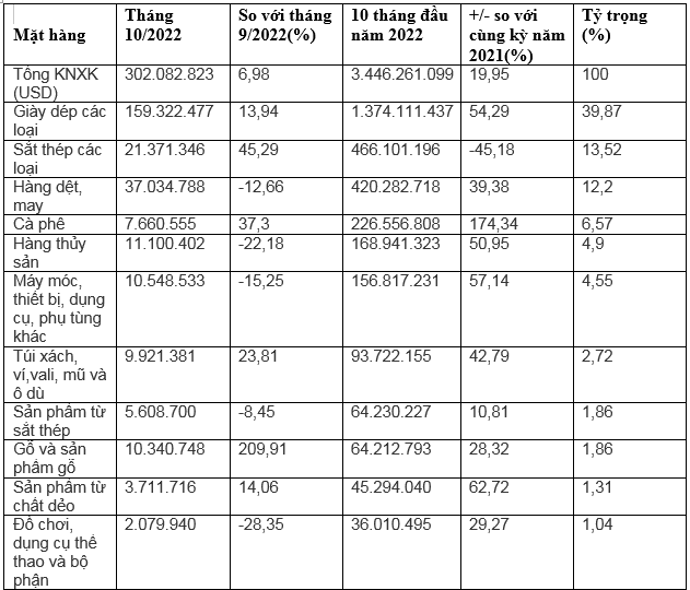 Tiếp đến là mặt hàng sắt thép, trị giá 466 triệu USD trong 10 tháng đầu năm 2022, giảm 45,1% so với cùng kỳ năm trước và chiếm 13,5% tỷ trọng xuất k hẩu. Đứng thứ 3 là dệt may đạt 420,2 triệu USD, tăng 39,3% so với cùng kỳ năm trước, chiếm 12,21% tỷ trọng xuất khẩu.