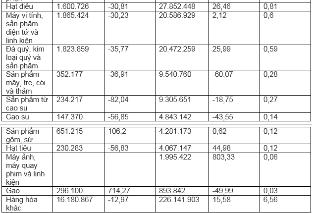Những mặt hàng có kim ngạch xuất khẩu tăng trưởng khá trong 10 tháng đầu năm 2022 so với cùng kỳ năm trước: Máy móc, thiết bị dụng cụ phụ tùng tăng 57,1%; hàng thủy sản tăng 50,9%; sản phẩm từ chất dẻo tăng 62,7%; máy ảnh, máy quay phim và linh kiện tăng gấp 8 lần.