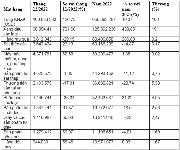 Mặt hàng có kim ngạch xuất khẩu lớn nhất sang thị trường Lào trong tháng 12/2022 là xăng dầu các loại, đạt 60 triệu USD, tăng 721,6% so với tháng trước đó, tính chung năm 2022 đạt 125,3 triệu USD, tăng 438% so với cùng kỳ năm 2021, chiếm 19% tỷ trọng xuất khẩu.