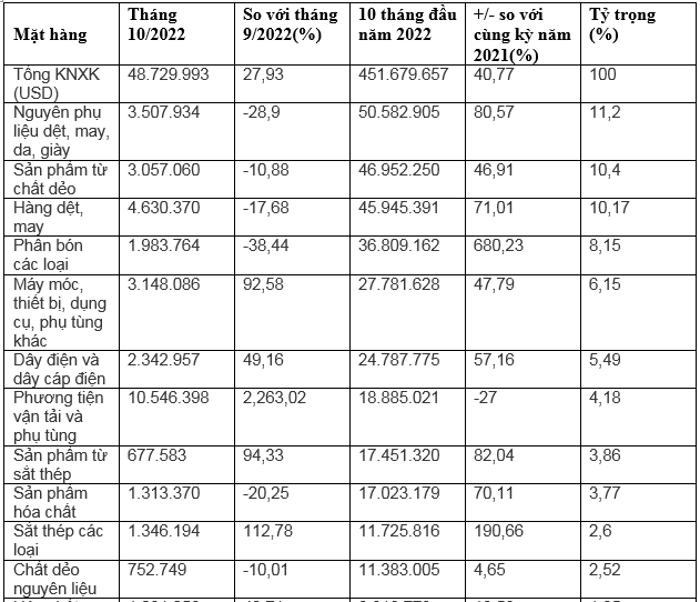 Số liệu xuất khẩu hàng hóa Việt Nam sang Myanmar 10 tháng đầu năm 2022