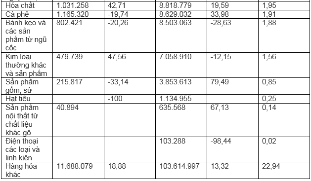 Một số đạt kim ngạch xuất khẩu tăng trưởng: Hàng dệt may tăng 71%; phân bón các loại tăng 680,2%; sản phẩm từ sắt thép tăng 82%; sản phẩm hóa chất tăng 70,1%; sắt thép các loại tăng 190,6%; sản phẩm gốm sứ tăng 79,4%.