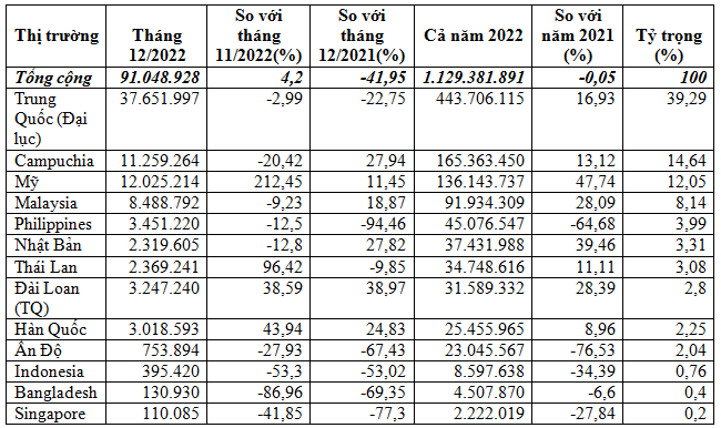 Trong đó riêng tháng 12/2022 đạt 91,05 triệu USD, tăng 4,2% so với tháng 11/2022 nhưng giảm mạnh 42% so với tháng 12/2021.