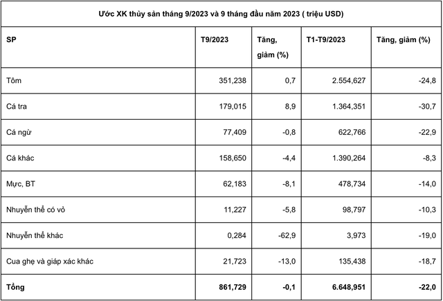 Tháng 9, xuất khẩu thủy sản của Việt Nam ước đạt 862 triệu USD, tương đương cùng kỳ năm 2022. Một số sản phẩm chủ lực đã lấy lại sự cân bằng so với cùng kỳ năm ngoái. Trong đó, xuất khẩu tôm và cá ngừ trong tháng 9 đều đạt mức tương đương với tháng 9/2022. Mặt hàng cá tra tăng trưởng dương 9% so với cùng kỳ năm ngoái lên 179 triệu USD. Xuất khẩu các sản phẩm khác như mực, bạch tuộc, cua – ghẹ, nhuyễn thể có vỏ vẫn thấp hơn cùng kỳ, nhưng mức giảm chỉ từ 6-12%.