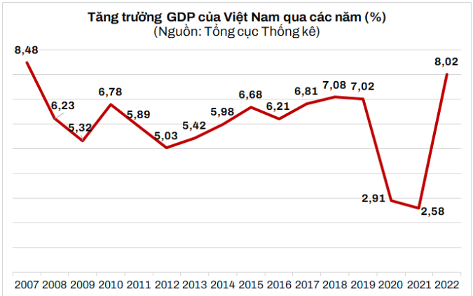 Tổng sản phẩm trong nước (GDP) năm 2022 ước tính tăng 8,02% so với năm trước, đạt mức tăng cao nhất trong giai đoạn 2011-2022 do nền kinh tế khôi phục trở lại.