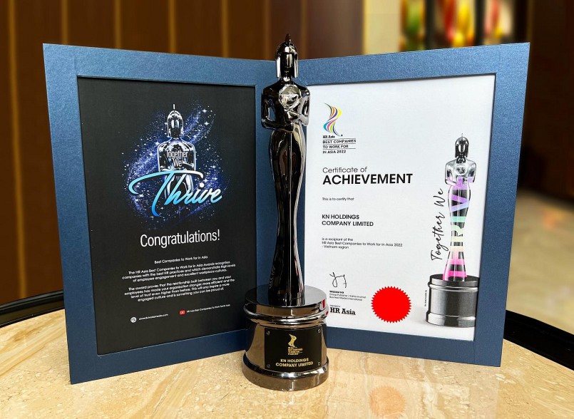 Tại đêm vinh danh và trao thưởng HR Asia, KN Holdings được xướng tên ở hạng mục cấp châu lục. Để đạt giải thưởng danh giá này, Tập đoàn đã vượt qua bộ tiêu chí khắt khe gồm 50 tiêu chí theo mô hình T.E.A.M (Total Engagement Assessment Model), với 3 yếu tố tác động trực tiếp đến sự hài lòng của nhân viên: Core (cơ cấu tổ chức), Self (cá nhân) và Group (tập thể).