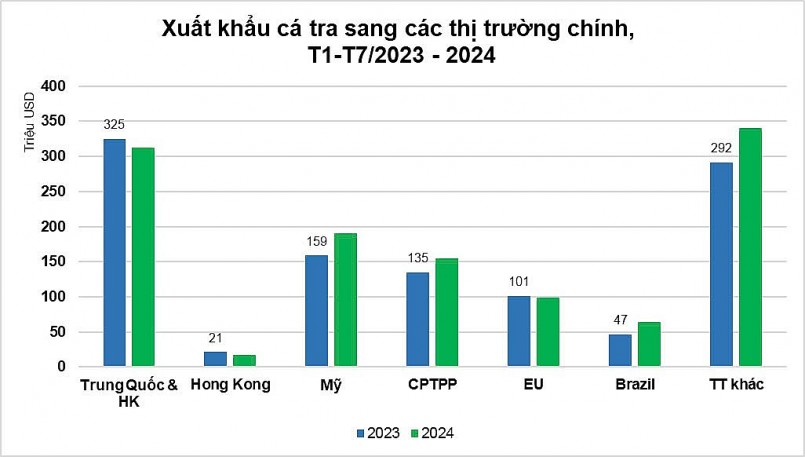 Về thị trường tiêu thụ, Trung Quốc và Hồng Kông (Trung Quốc) vẫn tiếp tục là thị trường tiêu thụ nhiều nhất cá tra Việt Nam. Trong tháng 7, xuất khẩu sang thị trường này đạt 55 triệu USD, tăng 23% so với cùng kỳ năm ngoái. 7 tháng đầu năm nay, xuất khẩu cá tra sang Trung Quốc và Hồng Kông (Trung Quốc) đạt 313 triệu USD, giảm 4% so với cùng kỳ, chủ yếu do giảm trong tháng 2 và tháng 3/2024.