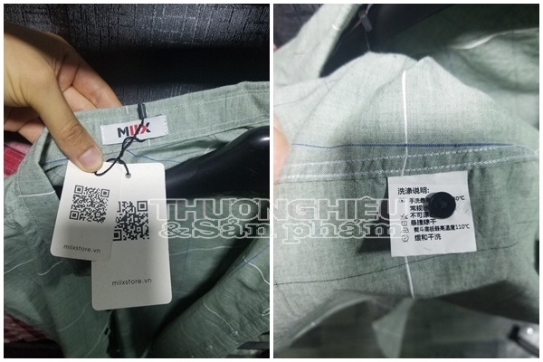 Sản phẩm áo sơ mi nam được bán tại của hàng H2T shop trên cổ áo và nhãn thể hiện thương hiệu "MIIX" nhưng nhãn phía trong áo lại toàn tiếng nước ngoài.