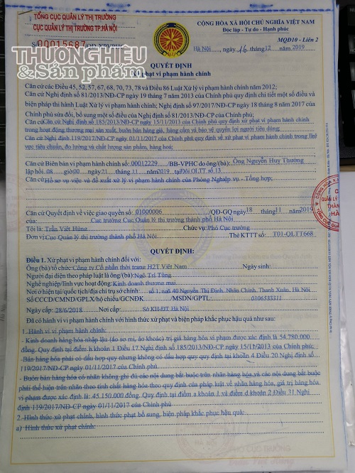 Tại buổi làm việc ông Tùng cũng đã cung cấp cho phóng viên một số tài liệu liên quan đến việc đăng ký nhãn hiệu H2T, một số hóa đơn xuất nhập hàng của công ty... Đặc biệt, ông Tùng cũng đã không “ngần ngại” cung cấp cho phóng viên Biên bản kiểm tra, Quyết định xử phạt của Cục QLTT Hà Nội đối với hàng nhập khẩu của H2T vào năm 2019.