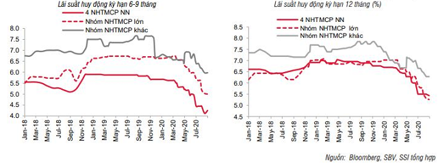 Lãi suất tiền gửi không có nhiều thay đổi, phổ biến ở mức 3-4%/năm với kỳ hạn dưới 6 tháng, 4,2-6%/năm với kỳ hạn 6 đến dưới 12 tháng và 5-6,7%/năm với kỳ hạn 12, 13 tháng. Theo thông tin từ NHNN, tổng phương tiện thanh toán (cung tiền M2) tại cuối tháng 7 là 11,16 triệu tỷ đồng, tăng 5,6% so với cuối năm 2019, con số này thấp hơn nhiều so với mức tăng 7-8% của cùng kỳ 3 năm trước đó.