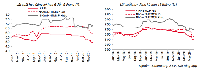 TH&SP Thanh khoản thị trường 2 dồi dào khiến lãi suất liên ngân hàng tiếp tục giảm. Một số NHTM giảm lãi suất tiền gửi 10-20 điểm cơ bản với kỳ hạn 12 và 13 tháng. Các ngân hàng kỳ vọng khả quan trong 6 tháng cuối năm 2020.