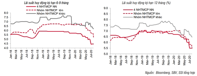 Lãi suất tiền gửi tiếp tục được điều chỉnh giảm ở một số ngân hàng TMCP lớn, mức giảm từ 20-50 điểm cơ bản ở tất cả các kỳ hạn khiến lãi suất tiền gửi của nhóm này về sát với lãi suất của 4 NHTM Nhà nước lớn. Trong 7 tháng đầu năm, mặt bằng lãi suất tiền gửi đã hạ xuống thấp hơn từ 1-2% so với cuối năm 2019 ở phần lớn các NHTM. Tính bình quân, lãi tiền gửi đã giảm 70-90 điểm cơ bản ở kỳ hạn dưới 12 tháng và giảm khoảng 100 điểm cơ bản ở các kỳ hạn trên 1 năm so với mức bình quân năm 2019.