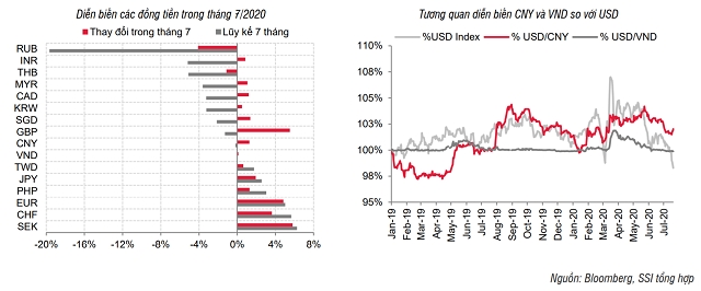 Vốn đầu tư nước ngoài vào Việt Nam tiếp tục cải thiện trong tháng 7 với FDI giải ngân và đăng ký đều tăng so với cùng kỳ năm 2019, lần lượt là 1,38% và 49,3%. Dịch bệnh cũng đang bùng phát trở lại tại Việt Nam nhưng sự suy yếu của USD trên thị trường quốc tế và nguồn cung USD khá tích cực sẽ hỗ trợ tỷ giá USD/VND tiếp tục ổn định trong thời gian tới.
