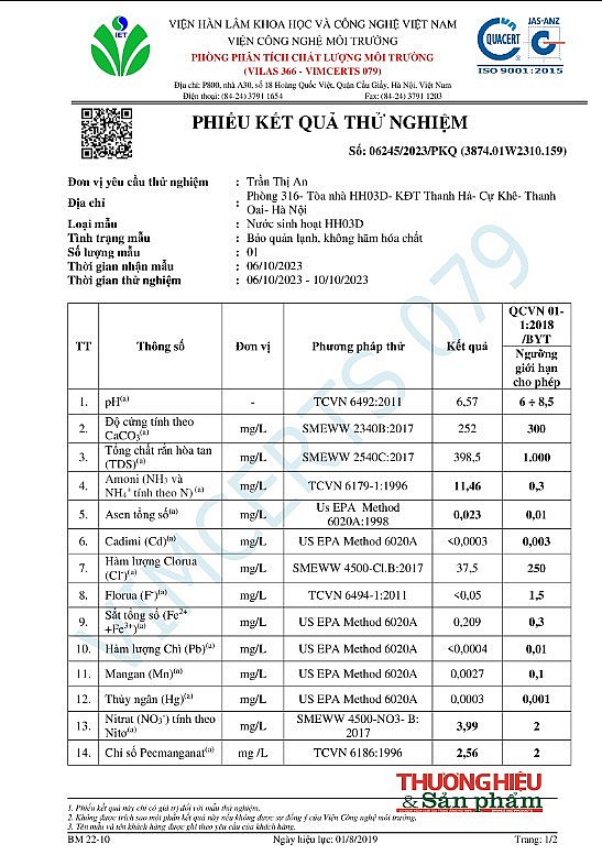 Ngày 10/10/2023, Phòng Phân Tích Chất Lượng Môi Trường trả kết quả. Trong phiếu kết quả kiểm nghiệm chỉ ra nhiều chất cao bất thường. Cụ thể, Hàm lượng Amoni kiểm tra là 11.46 mg/L và hàm lượng cho phép là 0.3mg/L. Hàm lượng asen tổng số kiểm tra 0,023 mg/L và hàm lượng cho phép là 0.01mg/L. Hàm lượng Nitrat tính theo Nitơ kiểm tra 3,99 mg/L và hàm lượng cho phép là 2 mg/L. Hàm lượng Chỉ số Pecmanganat kiểm tra 2,56 mg/L và hàm lượng cho phép là 2 mg/L. Hàm lượng Selen kiểm tra 0,0107 mg/L và hàm lượng cho phép là 0,01 mg/L. Hàm lượng Hàm lượng clo dư kiểm tra 27,8 mg/L và hàm lượng cho phép là 0,2 ÷ 1 mg/L.