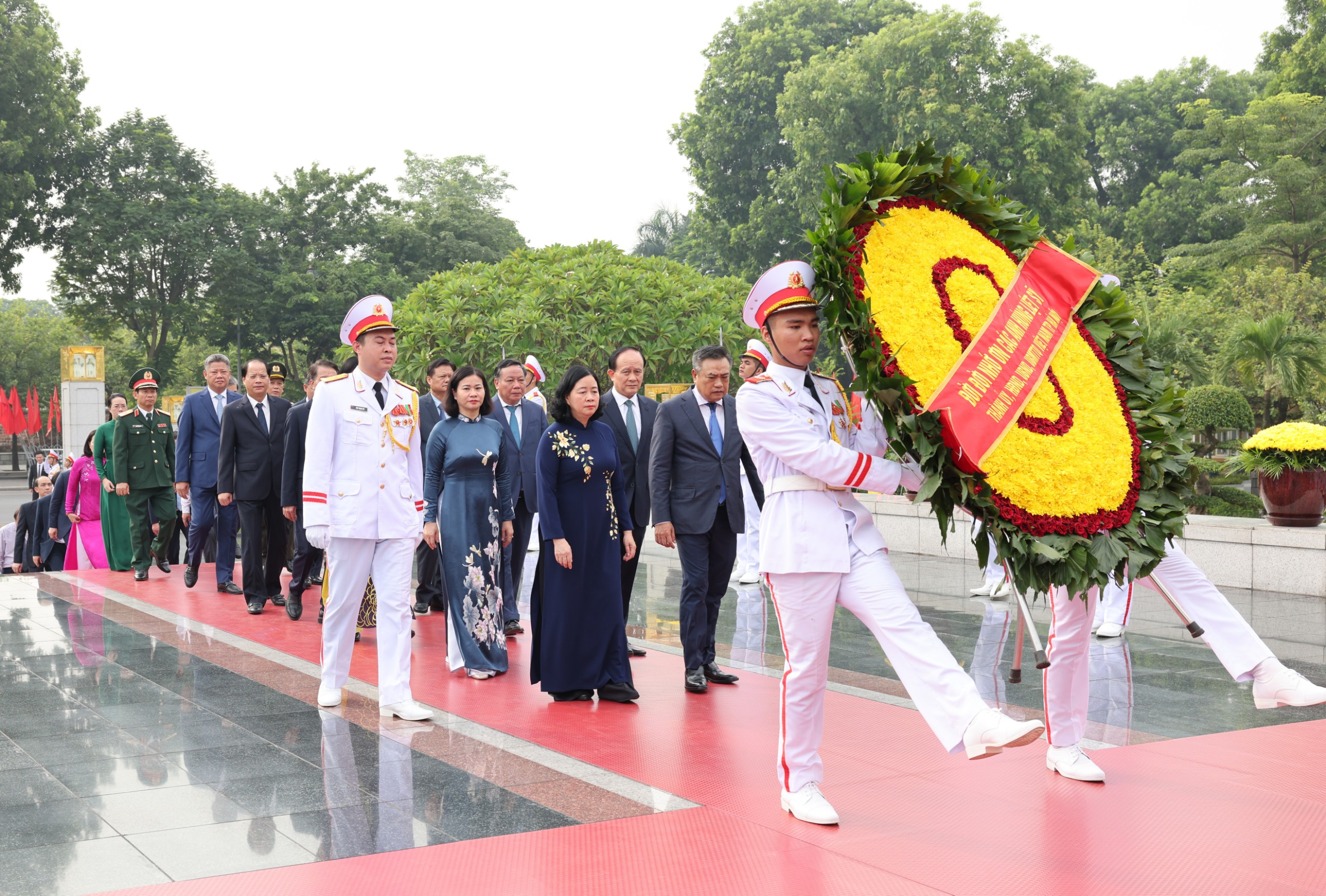 | Đoàn đại biểu Ban Chấp hành Trung ương Đảng, Chủ tịch nước, Quốc hội, Chính phủ, Ủy ban Trung ương Mặt trận Tổ quốc Việt Nam đặt vòng hoa, vào Lăng viếng Chủ tịch Hồ Chí Minh - Ảnh: VGP |