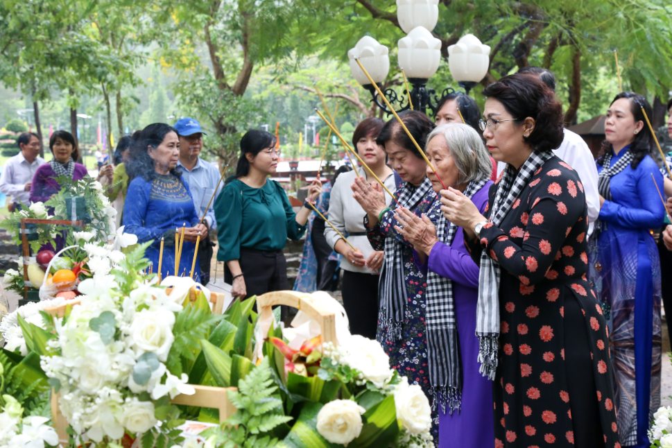 Các đại biểu đã dâng hương, dâng hoa với lòng thành kính hướng về anh linh các bậc tiền nhân, các anh hùng liệt sỹ, đồng bào yêu nước. Vòng hoa của đoàn mang dòng chữ: Thành ủy, HĐND, UBND, Ủy ban MTTQ Việt Nam TPHCM đời đời nhớ ơn các Anh hùng liệt sỹ.