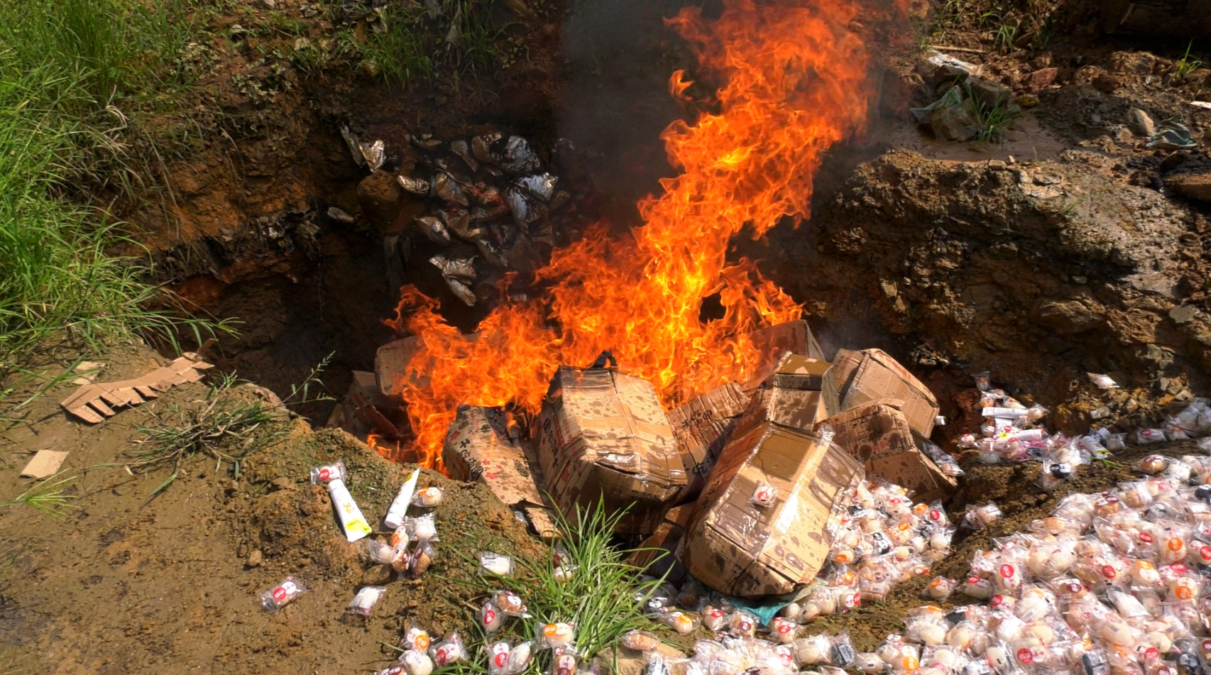 | Lực lượng chức năng tiến hành tiêu huỷ lô hàng vi phạm. |