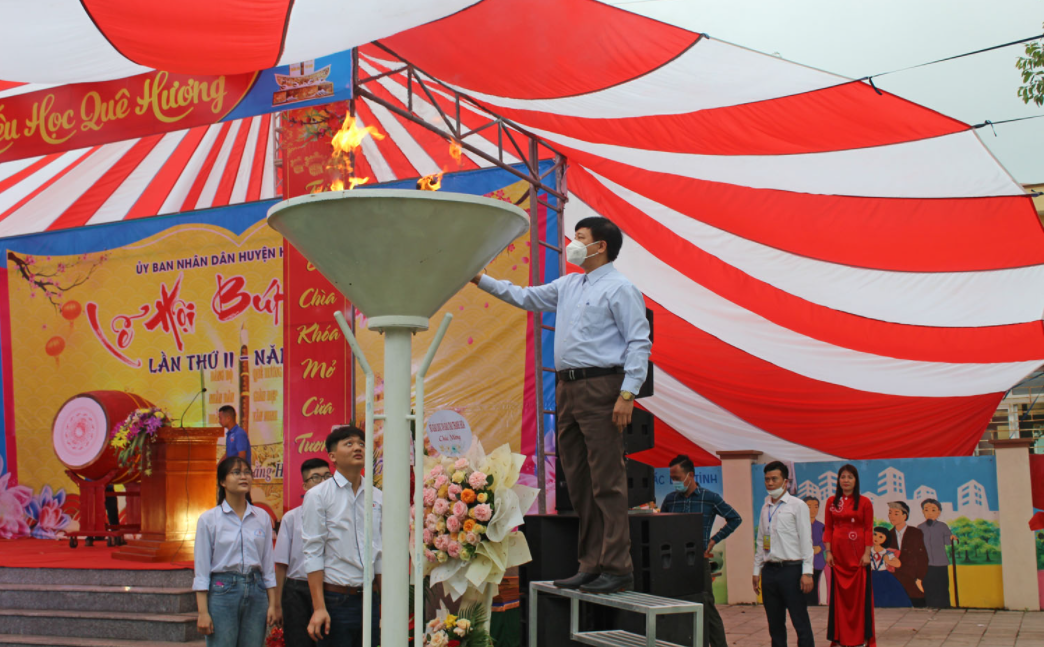 | Ông Lê Xuân Thu – Tỉnh ủy viên, Bí thư Huyện ủy, Chủ tịch HĐND huyện Hoằng Hóa thực hiện nghi thức châm đuốc. |