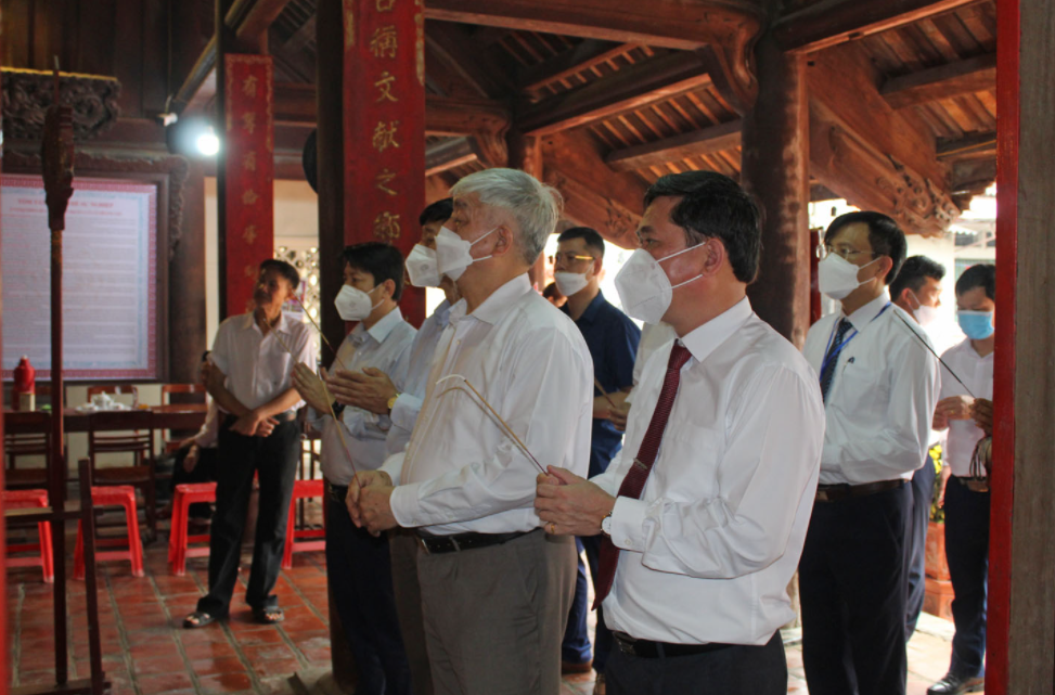 | Ông Lê Sỹ Nghiêm, Chủ tịch UBND huyện Hoằng Hóa (bìa phải) cùng các vị đại biểu dâng hương tại Di tích Quốc gia Bảng Môn Đình (xã Hoằng Lộc). |