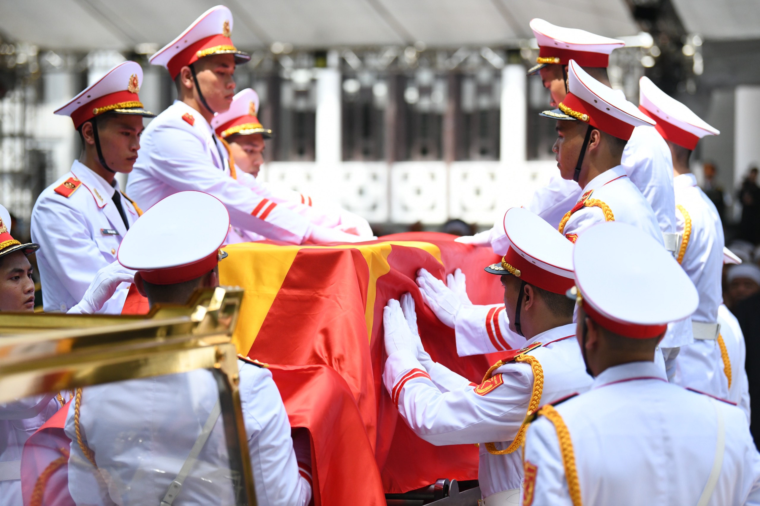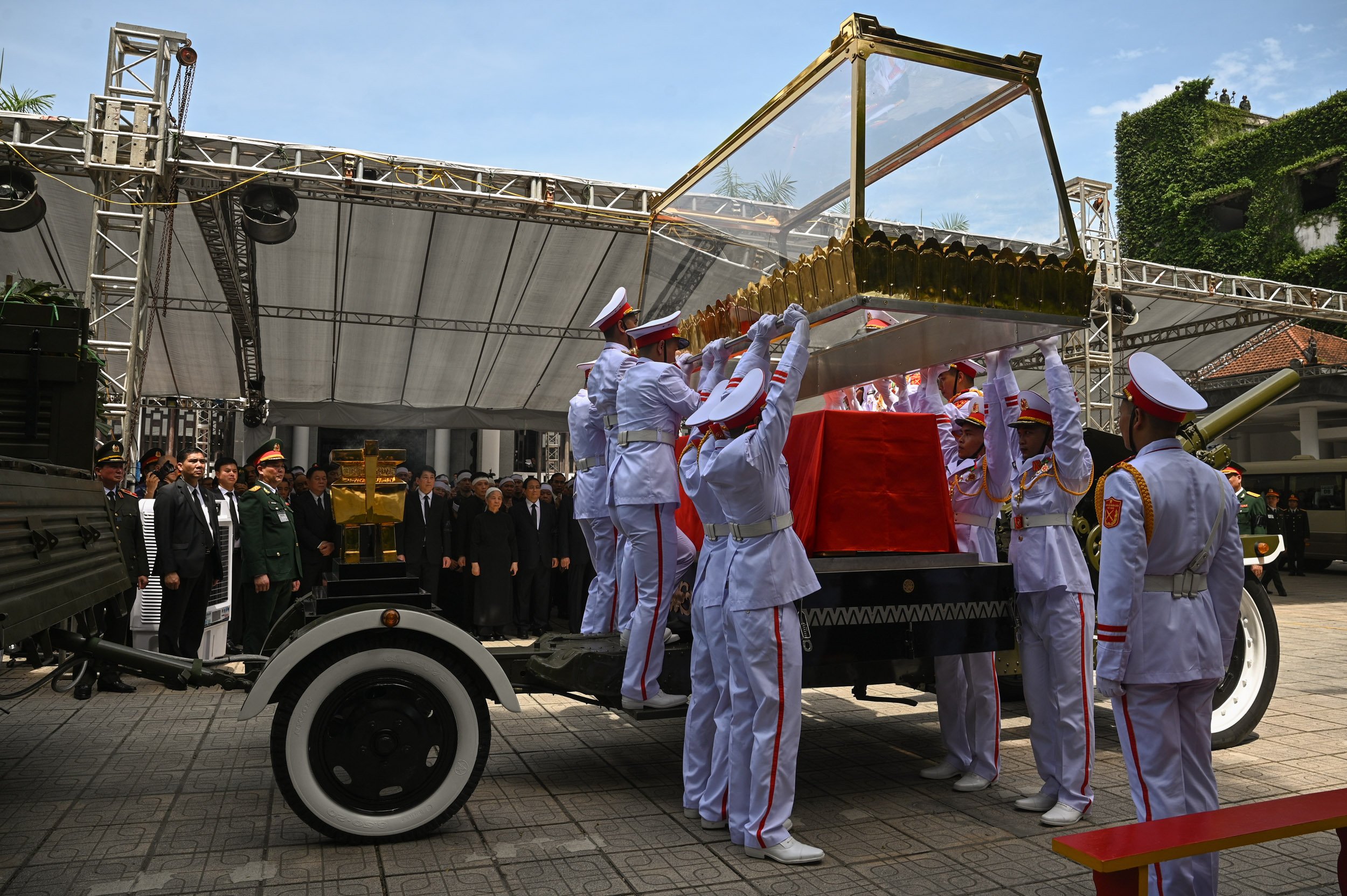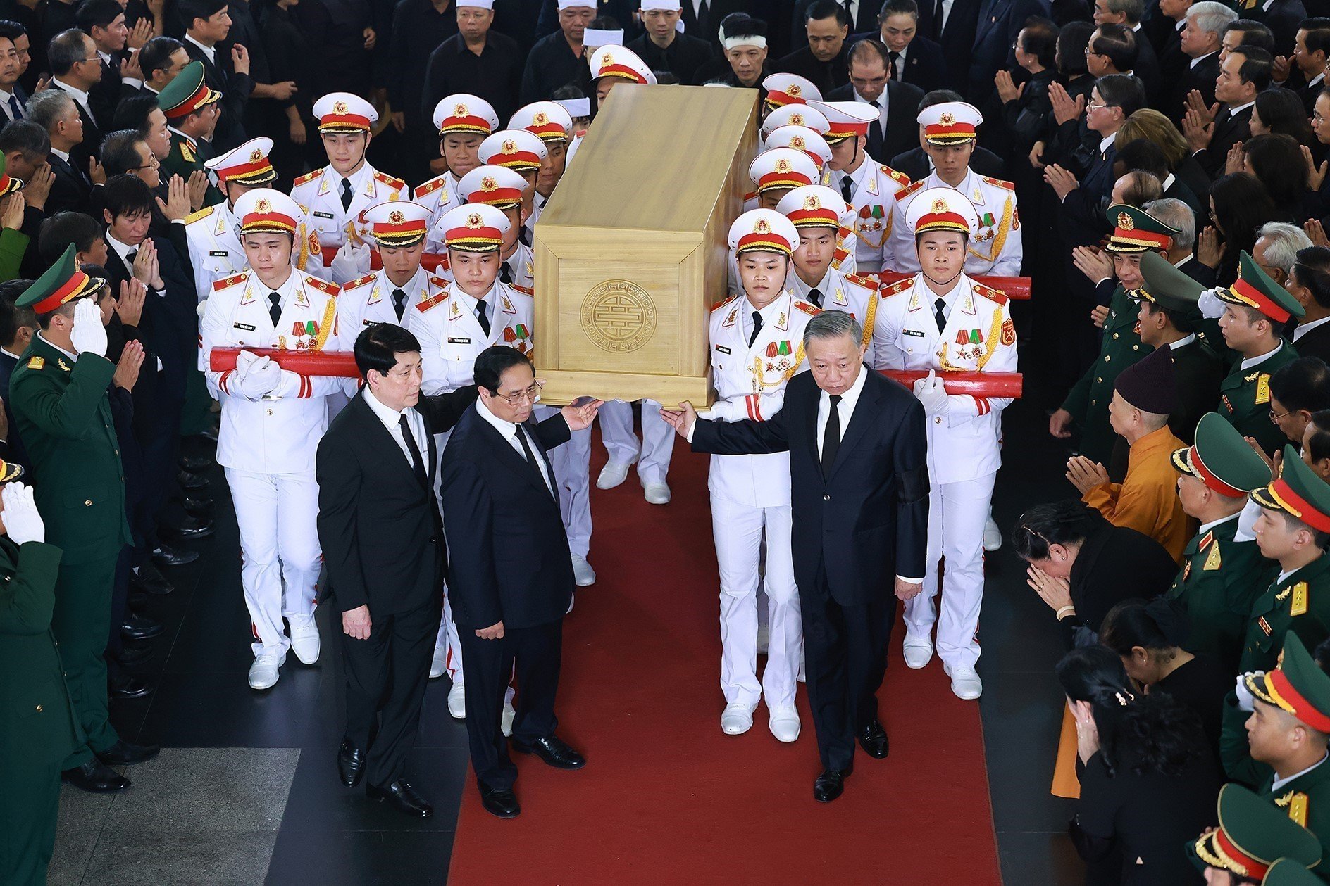 Các đồng chí lãnh đạo Đảng, Nhà nước đưa linh cữu Tổng Bí thư Nguyễn Phú Trọng ra linh xa, tiễn đưa đồng chí về nơi an nghỉ cuối cùng.