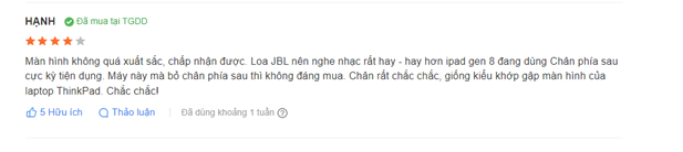 Là khách đã mua hàng và sử dụng sản phẩm, chị Hạnh bộc bạch rằng màn hình tuy không xuất sắc nhưng đổi lại chất lượng loa rất hay, thích hợp để nghe nhạc. Chị cũng so sánh thêm với các loại hình máy tính bảng khác như ipad gen 8 thì máy tính bảng Lenovo Yoga Tab tiện dụng hơn.