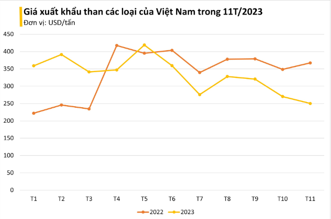 Trong tháng 5/2023, giá than xuất khẩu đã lập đỉnh trong giai đoạn 2020 đến nay với 419 USD/tấn. Tuy nhiên giá mặt hàng này lại liên tiếp lao dốc, chỉ đạt 250 USD/tấn vào tháng 11, mức thấp nhất kể từ đầu năm. Bình quân 11 tháng năm 2023, giá than xuất khẩu ở mức 313,6 USD/tấn, giảm 8,7% so với cùng kỳ năm 2022.