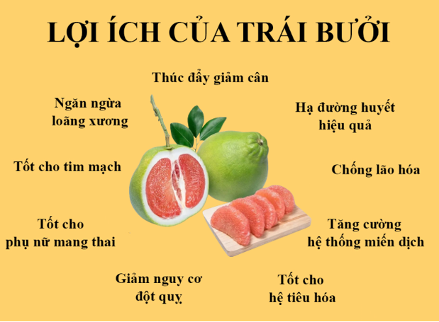 Giúp giảm cân: Bưởi được xem là một loại hoa quả giúp giảm cân tự nhiên. Đây là loại quả chứa rất ít calo nhưng lại là một loại trái cây bổ dưỡng, tốt cho sức khỏe.. Trong một quả bưởi, có đến hơn 15 loại vitamin và khoáng chất.