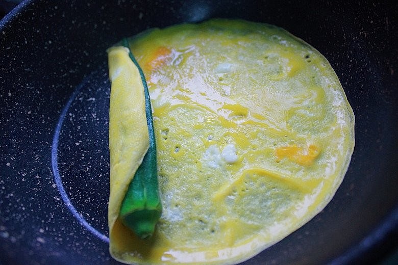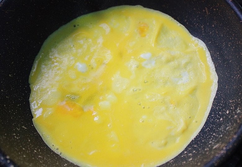 Sau đó múc một muôi trứng, đổ vào chảo, vặn nhỏ lửa, chiên cho đến khi trứng hơi đông lại, mặt trên vẫn còn ẩm ướt.